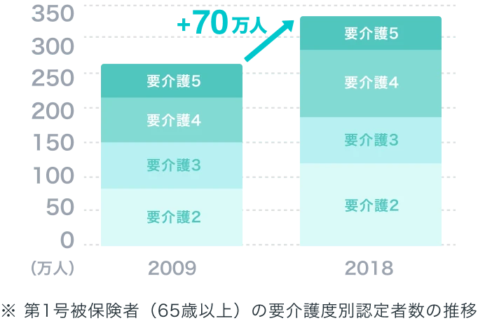 高齢化社会の進展に伴い、要介護者・介護者数は年々増加しています。